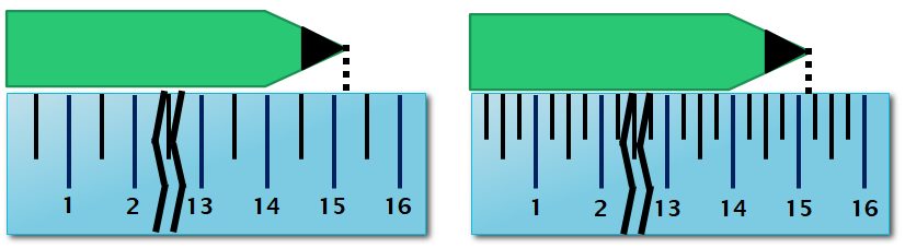 위의 첫 번째 자를 본다면 15.1이라는 측정값의 오차가 ±0.5인 경우, 정확한 값은 15.0와 15.5 사이에 존재한다.