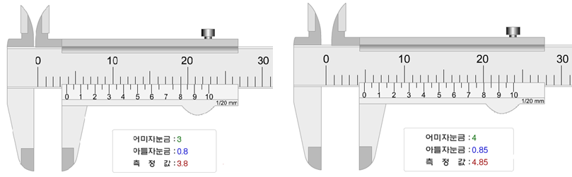 - 어미자의 눈금은 1mm, 아들자의 눈금은 0.05mm 간격