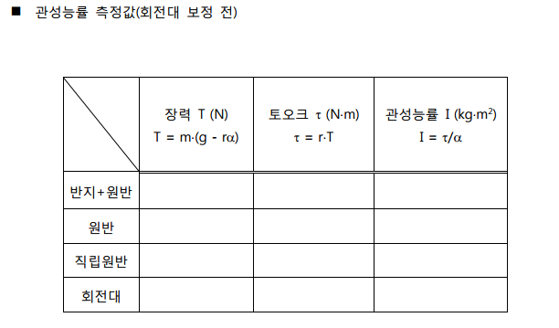 그러므로 반지+원반 데이터 값에서 원반 데이터 값을 빼서 반지의 관성 능률을 계산해 볼 수 있다.