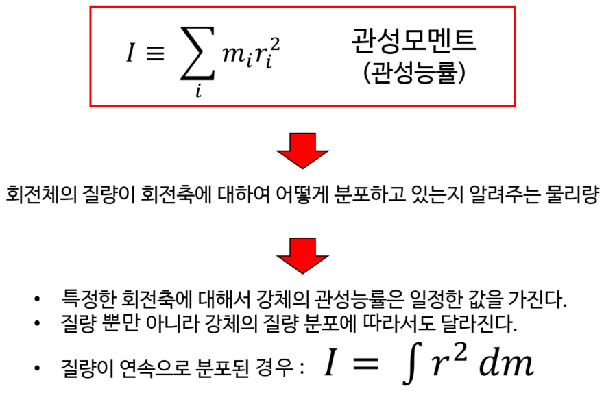 - 물체가 자신의 회전 운동을 유지하려는 정도를 나타내는 물리량으로써 직선 운동에서의 질량에 대응되는 양