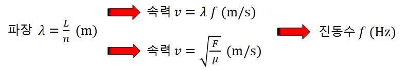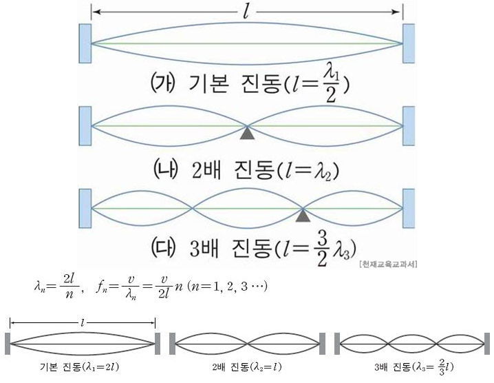 전체 줄의 길이는 L 로 모두 같지만 진동에 따라 파장의 변화가 생긴다.