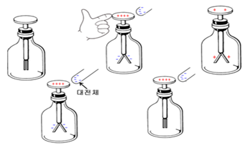 - 대전체에 의해 척력이 발생하여 금속박 쪽으로 대전체와 같은 극의 전기를 띄게 된다.