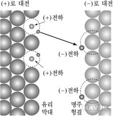 이때 전자를 잃은 쪽이 (+), 전자를 얻은 쪽이 (-)로 대전된다.