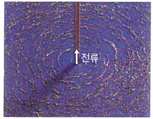 직전 도선에 전류가 흐르면 주위에 도선을 중심으로 한 동심원 모양의 자기장이 생긴다.