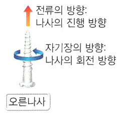 오른나사 법칙 - 오른나사를 전류의 방향으로 진행 할때 나사가 돌아가는 방향이 자기장의 방향이다.
