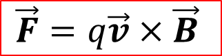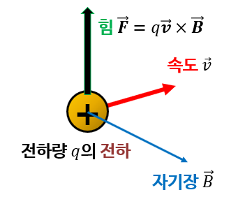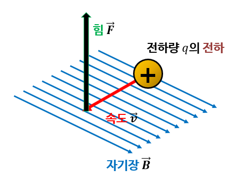 균일한 자기장B 안으로 전하량 q의 전하가 수직 하게 들어가면 윗 방향으로 힘을 받는다.